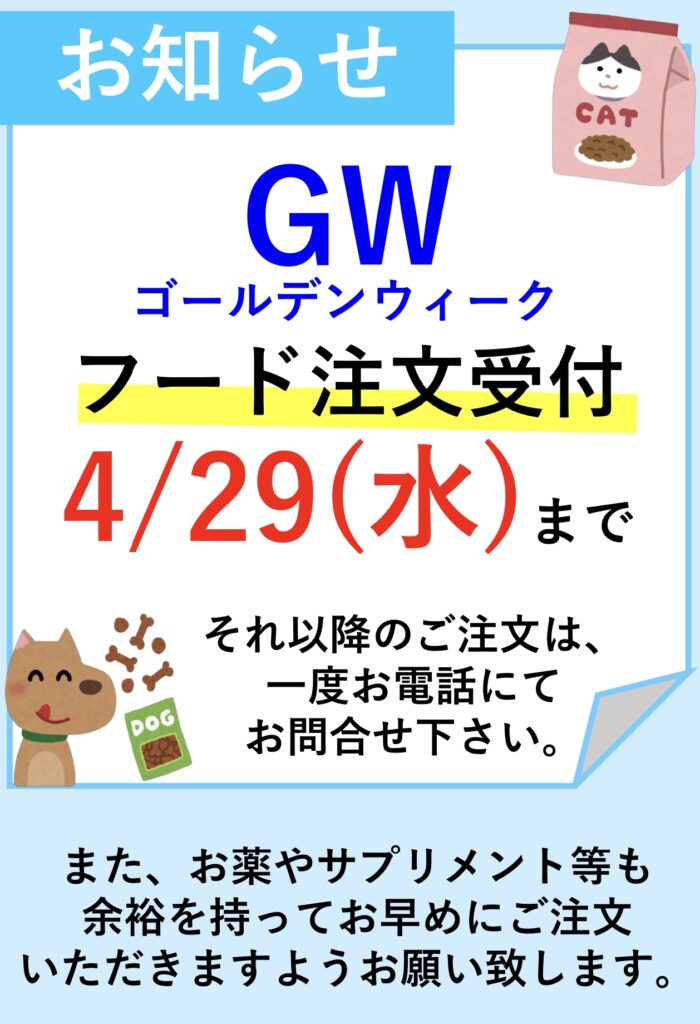 GWのフード購入についてのページ。日進市梅森台の動物病院なら、梅森どうぶつ病院